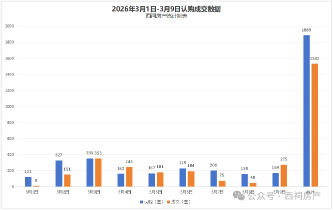 在新房端,据西祠房产统计南京网房数据,截至发稿,今年3月已认购1889套,成交1532套。相比去年同期(2025.3.1-3.9共成交1390套),成交量更是上涨10%。其中,2026年3月7日~8日周末两天,南京新房认购259套,成交123套!