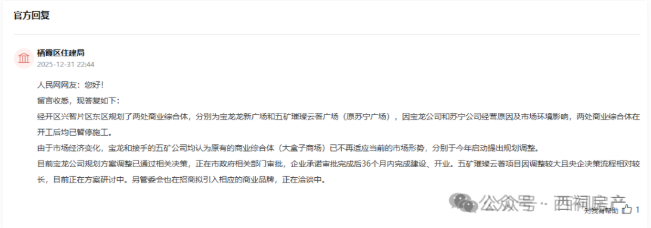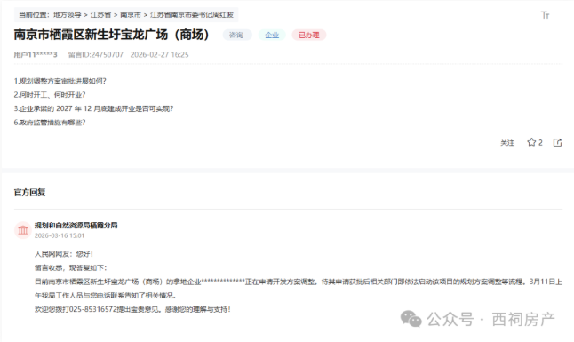 近期,人民网领导留言板上有网友询问南京市栖霞区新生圩宝龙广场(商场)规划调整方案审批进展如何?何时开工、何时开业?企业承诺的2027年12 月底建成开业是否可实现?政府监管措施有哪些?