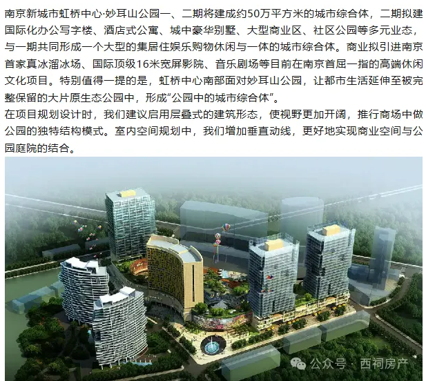 在规划之初,虹桥新城市中心二期将拟建国际化办公写字楼、酒店式公寓、城中豪华别墅、大型商业区、社区公园等业态,全部建成后,这里还将拥有健身中心、南京首家露天真冰溜冰场、国际顶级16米宽屏电影院、音乐剧场等商业娱乐设施。
