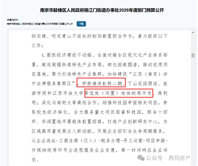 近日发布的《鼓楼区2026年政府工作报告》明确提出,要“大力攻坚虹桥新城市中心二期等项目”。同时,鼓楼区挹江门街道办事处在其2026年度部门预算中也列明,将“积极推进虹桥二期等低效(闲置)地块的再开发、再利用”。更早的2026年1月,该项目已被列入《南京市2026年经济社会发展重大项目名单》中的前期项目。>>>搁置20年!南京一批“骨灰级”项目,官宣重启!