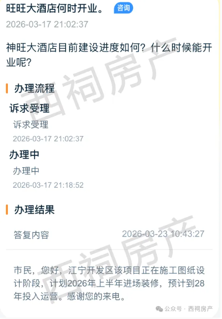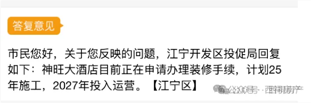 对此,西祠房产通过12345热线“宁诉办”进行咨询,相关部门回应:江宁开发区该项目正在施工图纸设计阶段,计划2026年上半年进场装修,预计到28年投入运营。
