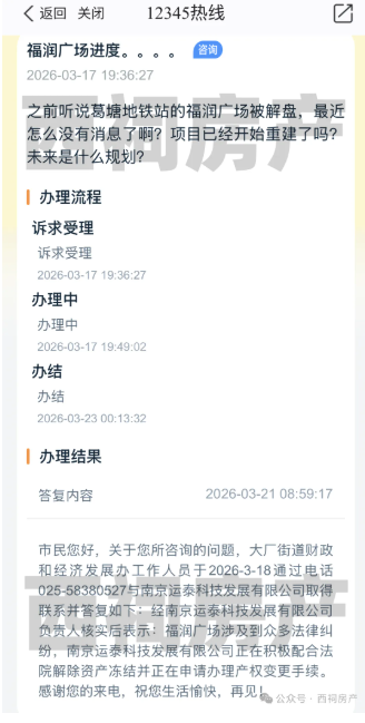 3月18日,大厂街道财政和经济发展办回复:“经南京运泰科技发展有限公司负责人核实后表示,福润广场涉及到众多法律纠纷,南京运泰科技发展有限公司正在积极配合法院解除资产冻结并正在申请办理产权变更手续。”