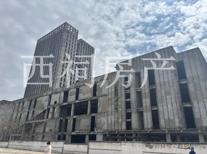 从航拍来看,项目裙楼与高层主体已经封顶,外立面斑驳、污渍遍布。