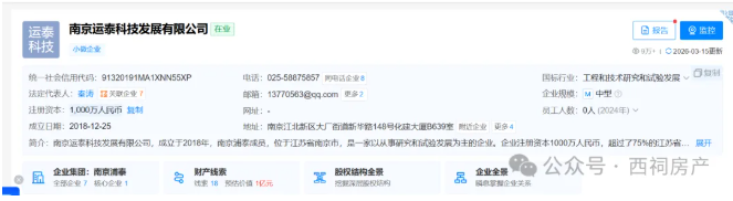 天眼查显示,南京运泰科技发展有限公司成立于2018年,实缴资本1000万人民币,法定代表人秦涛,是一家位于南京、以研究和试验发展为主的企业。该公司为南京浦泰集团成员,而浦泰集团此前在桥北开发了“浦泰和天下”项目。