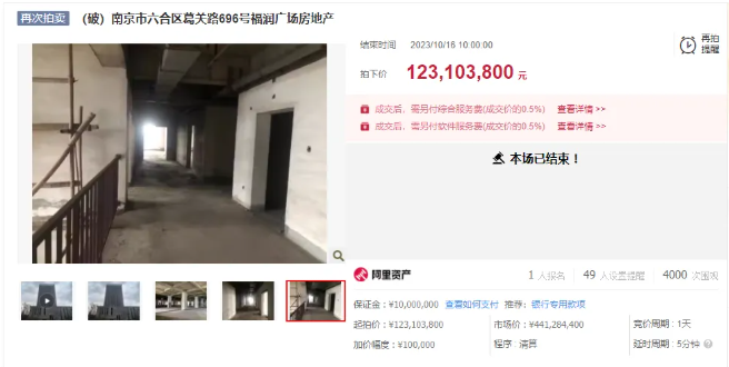 2023年10月16日,烂尾超十年的福润广场历经10次流拍后,在第11轮拍卖中成功成交,最终成交价约1.23亿元。对比约4.41亿元的市场估值,本次拿地相当于直接打了2.8折。