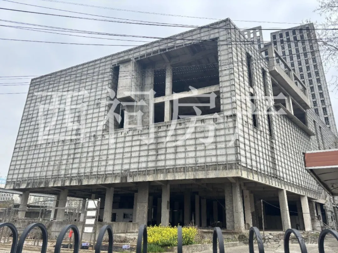 西祠房产在现场看到,福润广场烂尾楼仍保持着停工状态:门头写着“江苏天目建设集团福润广场项目部”,建筑外立面仅完成混凝土框架与网格状基层施工,未做任何装饰装修,大面积裸露的混凝土结构布满岁月痕迹。