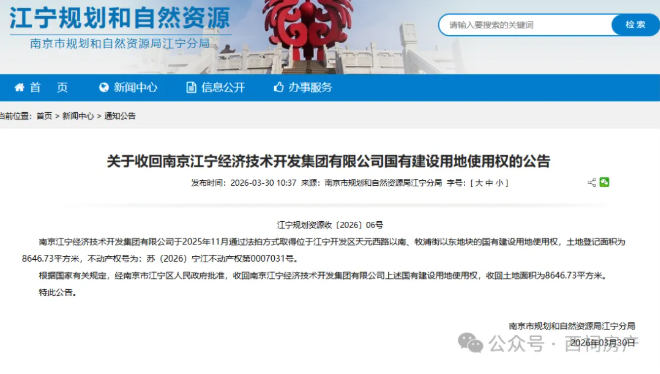 3月30日,南京市规划和自然资源局江宁分局官网发布公告,将收回南京江宁经济技术开发集团有限公司一宗国有建设用地使用权。公告显示,该公司于2025年11月通过法拍取得位于江宁开发区天元西路以南、牧浦街以东、面积为8646.73平方米的地块(不动产权证号:苏(2026)宁江不动产权第0007031号)。经江宁区人民政府批准,现依据国家相关规定,收回该地块使用权。