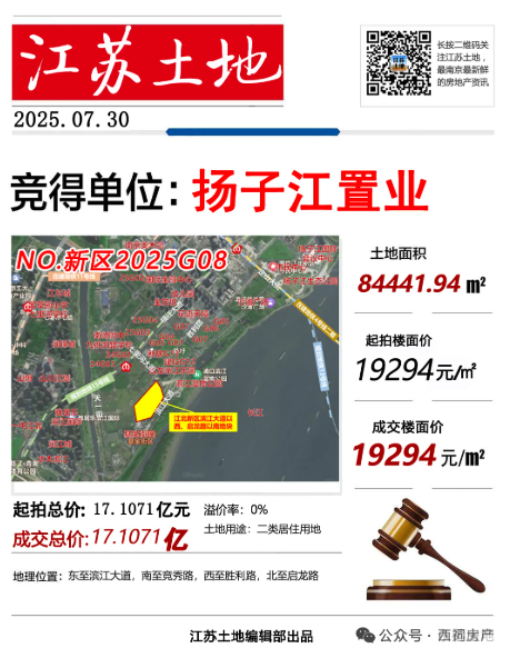 2025年7月30日,扬子江置业以底价17.1071亿拿下该地块,成交楼面价19294元/㎡。