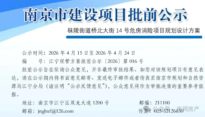 4月15日,“秣陵街道桥北大街14号危房消险项目规划设计方案批前公示”,根据公示内容,秣陵街道桥北大街14号拟按照“三原”原则翻建,即原址、原面积、原高度。