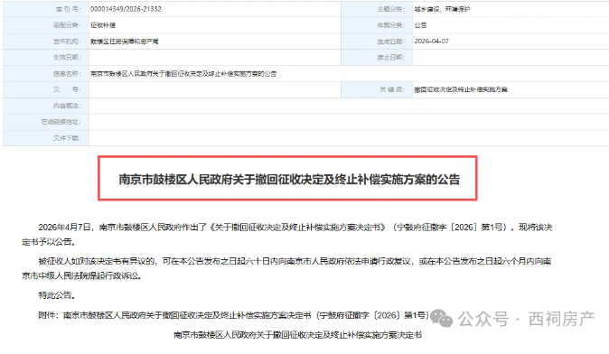 近日,南京市鼓楼区人民政府发布了一则关于撤回征收决定及终止补偿实施方案的公告,撤回2020年作出的大桥二处棚户区改造项目房屋征收决定,终止补偿实施方案。
