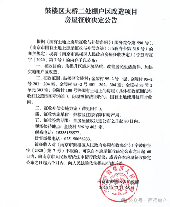 2020年12月28日,南京市鼓楼区人民政府作出《南京市鼓楼区人民政府房屋征收决定》(宁鼓府征字〔2020〕第7号),决定对鼓楼区金陵村;金陵村95-2号一层、金陵村95-2号201-204室、金陵村95-2号301、302、304室;金陵村95号2单元303室;金陵村100号等国有土地上的房屋予以征收,并公告了《鼓楼区大桥二处棚户区改造项目房屋征收补偿实施方案》。