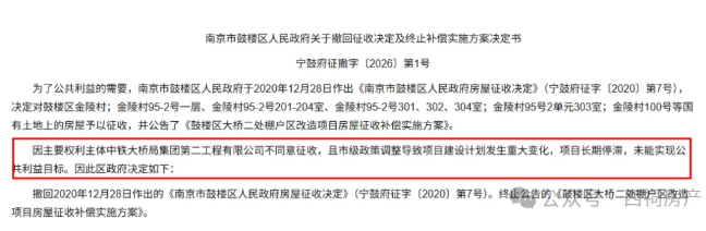 公告提到,因主要权利主体中铁大桥局集团第二工程有限公司不同意征收,且市级政策调整导致项目建设计划发生重大变化,项目长期停滞,未能实现公共利益目标。因此区政府决定如下:撤回2020年12月28日作出的《南京市鼓楼区人民政府房屋征收决定》(宁鼓府征字〔2020〕第7号)。终止公告的《鼓楼区大桥二处棚户区改造项目房屋征收补偿实施方案》。