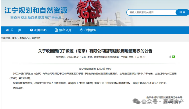 2025年1月21日,南京市规划和自然资源局江宁分局官网发布“关于收回西门子数控(南京)有限公司国有建设用地使用权的公告”,收回西门子数控(南京)有限公司位于江宁开发区西门子路18号地块的国有建设用地使用权,收回土地面积为33864.1平方米。