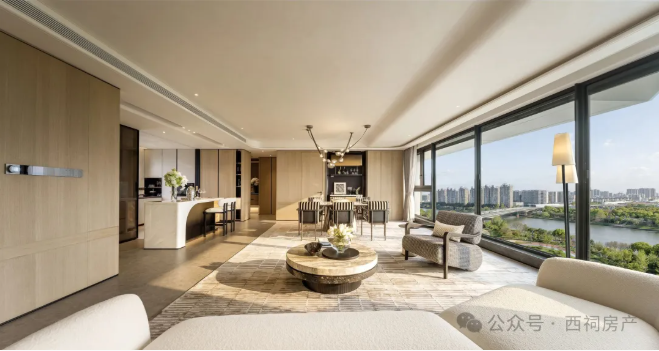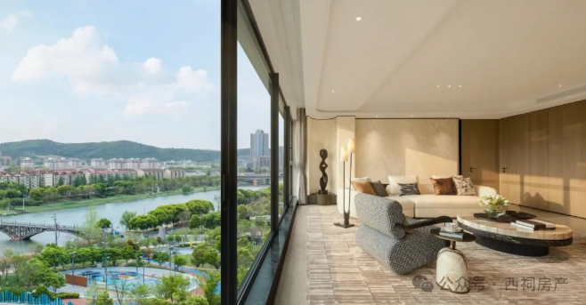再看近景的巨幕画框,约9米宽全景落地窗,比肩200㎡大平层的尺度,将河园盛境装裱成巨幕油画;