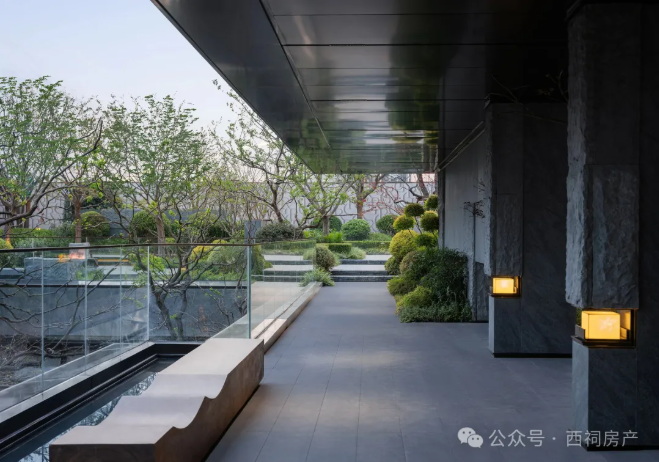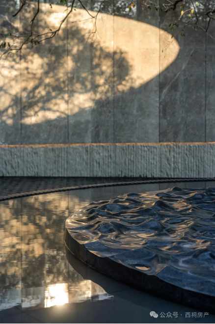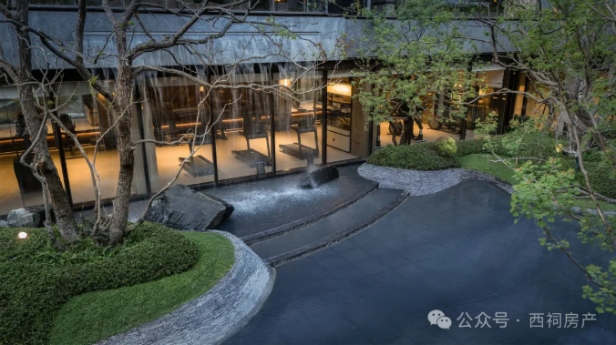 约7.5米瀑布飞流直下、名贵的丛生乌桕枝条舒展,与会所的巨幅玻璃恰好对景。从窗内望出去,是一幅会呼吸的山水长卷。乌桕红枫、景石叠瀑,天光树影交织成诗,水声清风不疾不徐,就连每一株树的姿态都极富禅意。