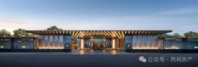约百米面宽、近7米高的门庭,媲美河西顶豪。景墙是百万级的马达加斯加矿源蓝翡翠奢石,穹顶下是安哥拉黑液态大理石,立柱以土耳其爱马仕灰大理石弧形收边,光影从曲面滑过透出无限尊崇。