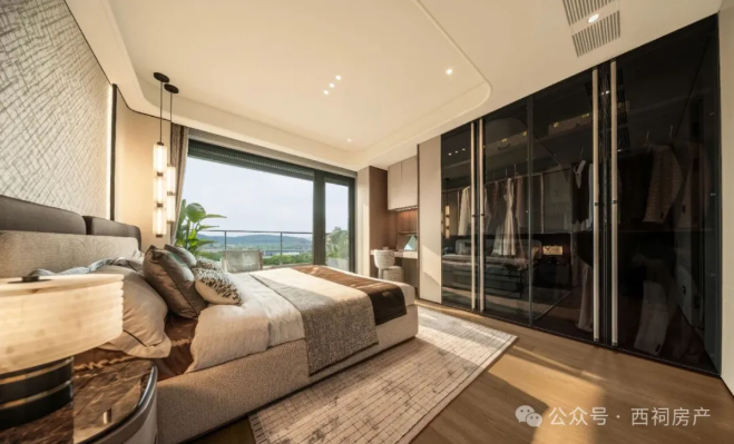 主卧小家化,私藏空中庭院:整面墙定制收纳系统,“衣柜+梳妆台” 复合区规划清晰,睡眠、收纳、梳妆、休闲、办公五区合一,关上门就是一个完整的私密套间。超12㎡南向全景露台,头排正观河园盛境,自成一方私密天地。